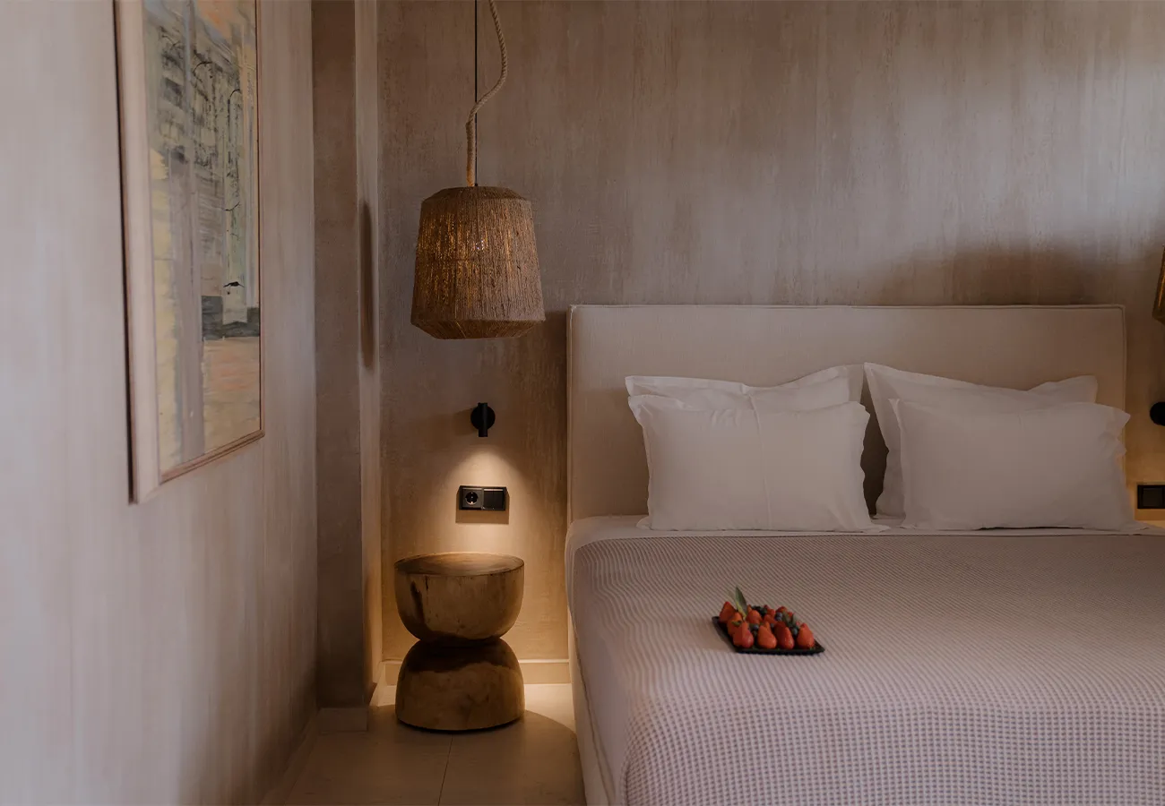 Indulge in the ultimate vacation experience by selecting from our four exquisite room types or our luxurious villa options. Each accommodation offers a unique blend of elegance, comfort, and boho-chic design, thoughtfully crafted to surpass your expectations and complement the serene beauty of the North Aegean.