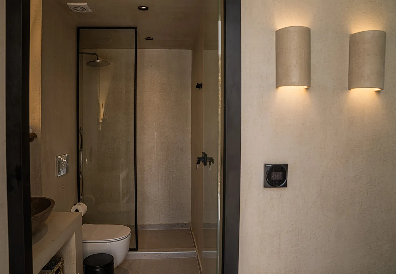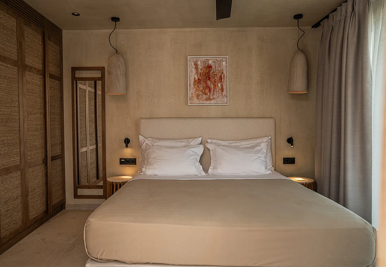 Ground Floor: Guests are welcomed into a warm, elegant space featuring handmade furnishings from natural materials. A bespoke wooden wardrobe with woven accents offers functional storage, while curated artwork and handcrafted clay light fixtures by local artisans add unique touches.
